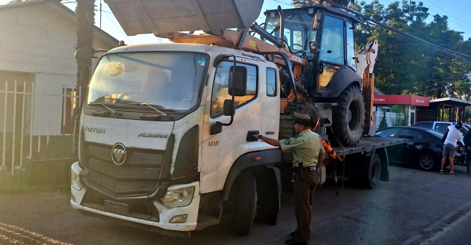 Personal policial luego de recibir información sobre el desplazamiento de un camión blanco cargado con una retroexcavadora por la Carretera San Martín y que habían sido robadas en Colina, según había denunciado el propietario, que seguía a poca distancia a los antisociales por la mencionada ruta, procedió a realizar la respectiva fiscalización en el sector de Auco, estableciendo que tanto el camión como la retroexcavadora no portaban patentes y eran las especies que habían sido denunciadas como robadas.