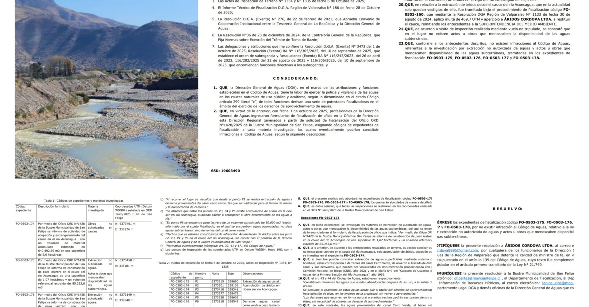 Tras los procesos de Fiscalización la DGA informó el cierre de los expedientes asociados a actividades desarrolladas en el río Aconcagua por la empresa Áridos Córdova Ltda., concluyendo que no se constató extracción no autorizada de aguas, ni afectación a aguas subterráneas, ni extracción de áridos desde el cauce.