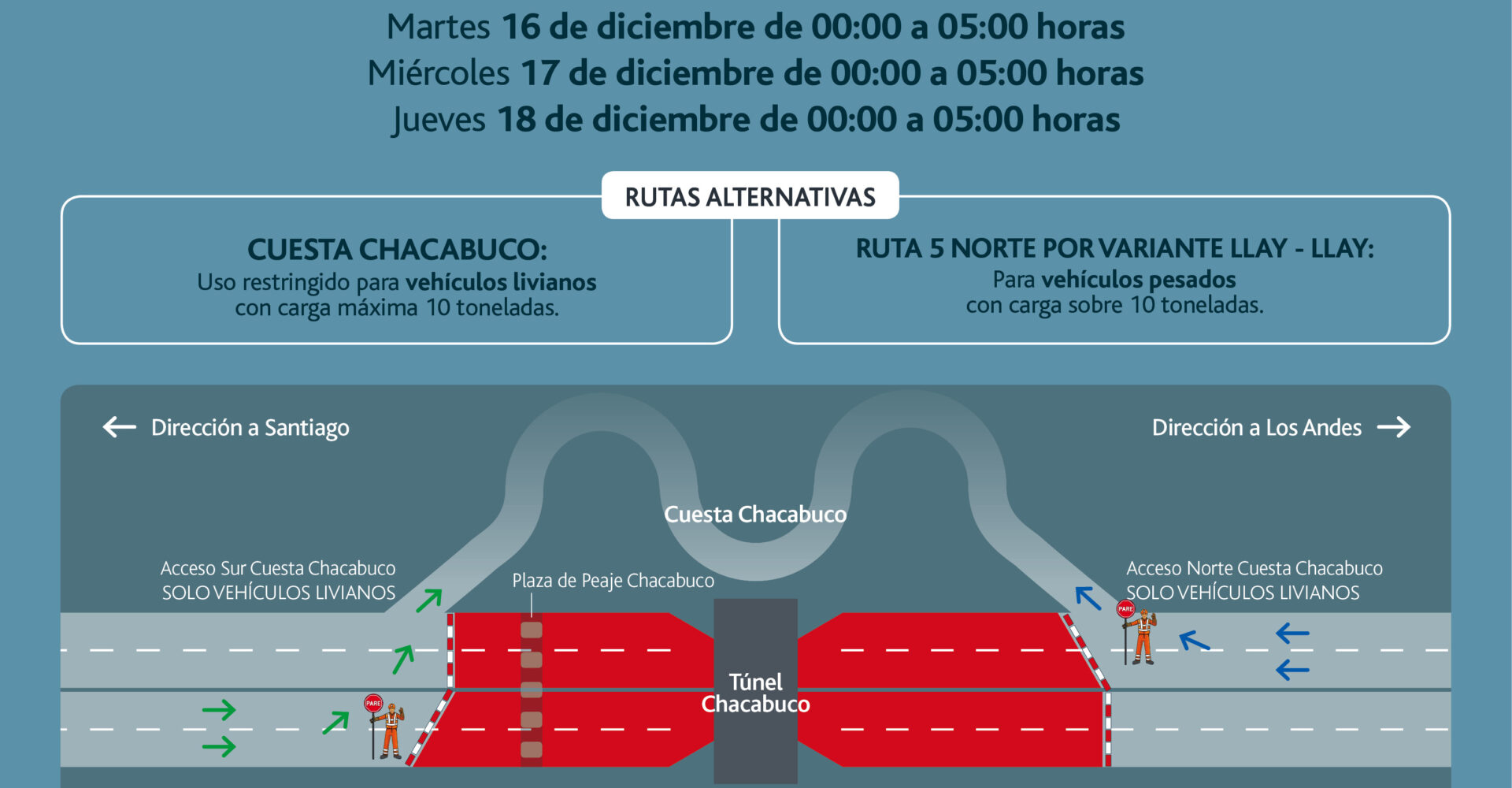 El Túnel Chacabuco, tiene una extensión de 2.1 kilómetros, uniendo las regiones de Valparaíso y Metropolitana. De acuerdo a lo informado, las obras conllevarán el corte de tránsito temporal en ambos sentidos, los siguientes días y horarios: