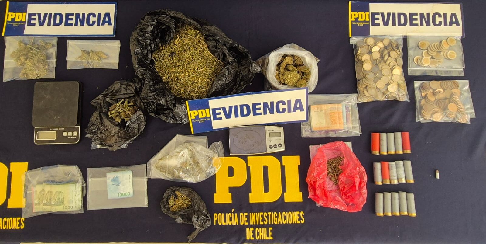 Durante el procedimiento se incautaron 276,3 gramos de cannabis sativa, además de $410.000 en dinero en efectivo, dos balanzas digitales utilizadas para la dosificación de la droga y munición correspondiente a 15 cartuchos calibre 12 y un cartucho calibre .25, el avalúo total de la droga incautada asciende a $1.381.500.